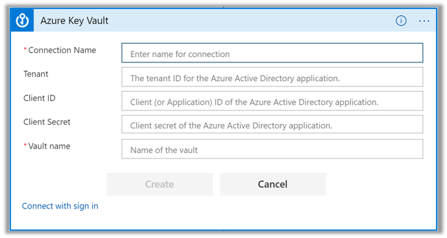 When using the connect with sign in method to authenticate to the KeyVault, the Logic Apps Designer needs only the tenant and vault name: