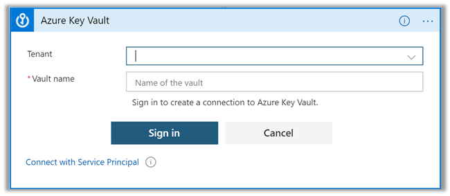 To connect with a service principal, you need to specify a connection name, vault name, tenantId, clientId and clientSecret from a registered app in Azure Active Directory.