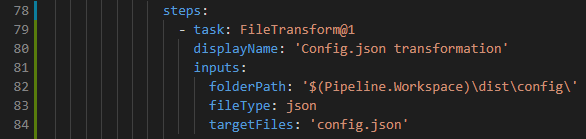 - The FileTransform task replaces the content of config.json with the variables defined in the YML pipeline:
